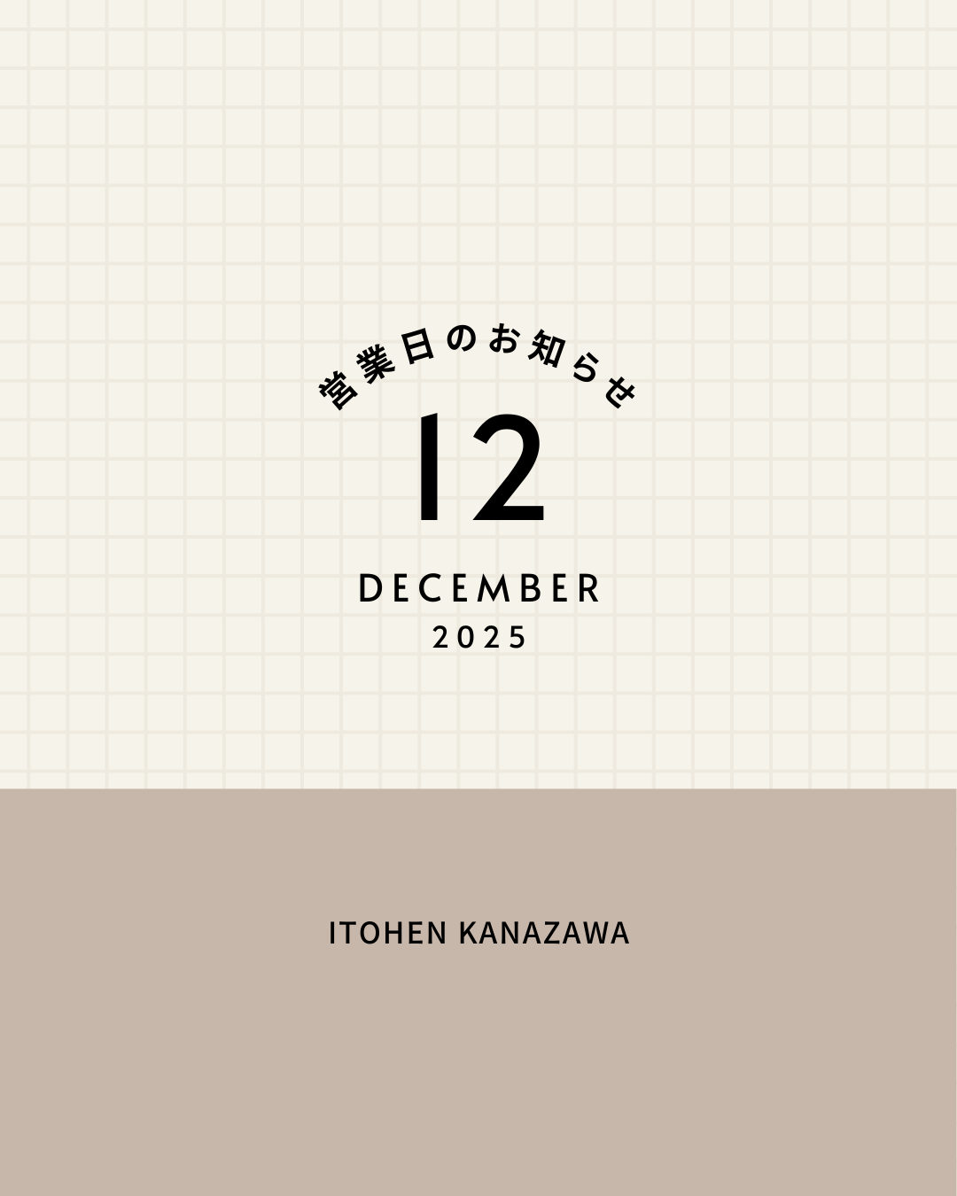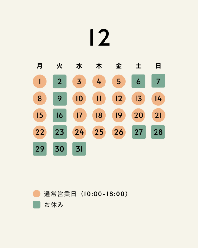 12月営業日 お知らせ 2025.11.27 12月営業日 金曜日が出張訪問日の為、不在になります。 誠に勝手ながら、臨時休業日及び年末年始での休業日がございます。 ご迷惑お掛け致しますが、よろしくお願い申し上げます。