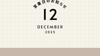 お知らせ 12月営業日 12月営業日金曜日が出張訪問日の為、不在になります。誠に勝手ながら、臨時休業日及び年末年始での休業日がございます。ご迷惑お掛け致しますが、よろしくお願い申し上げます。 2025.11.27 お知らせ